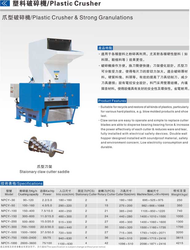 適用于各種逆料之粉碎再利用,尤其對各類硬性塑料(如料頭,鞋楦料等)效果更佳。NPCY系列破碎機(jī)操作方便,換刀簡便快捷;刀架優(yōu)化設(shè)計,爪型刀可分散受力度,便得每片刀和剪切力加大,適合破碎厚材料,硬質(zhì)料塊,料頭等,有效的提高了刀具切削力,減少刀具磨損;設(shè)有電控按全設(shè)計,料頭采用雙層結(jié)構(gòu),內(nèi)填隔音材料,使得設(shè)備具有良好的安全性及環(huán)保性,省電耐用。